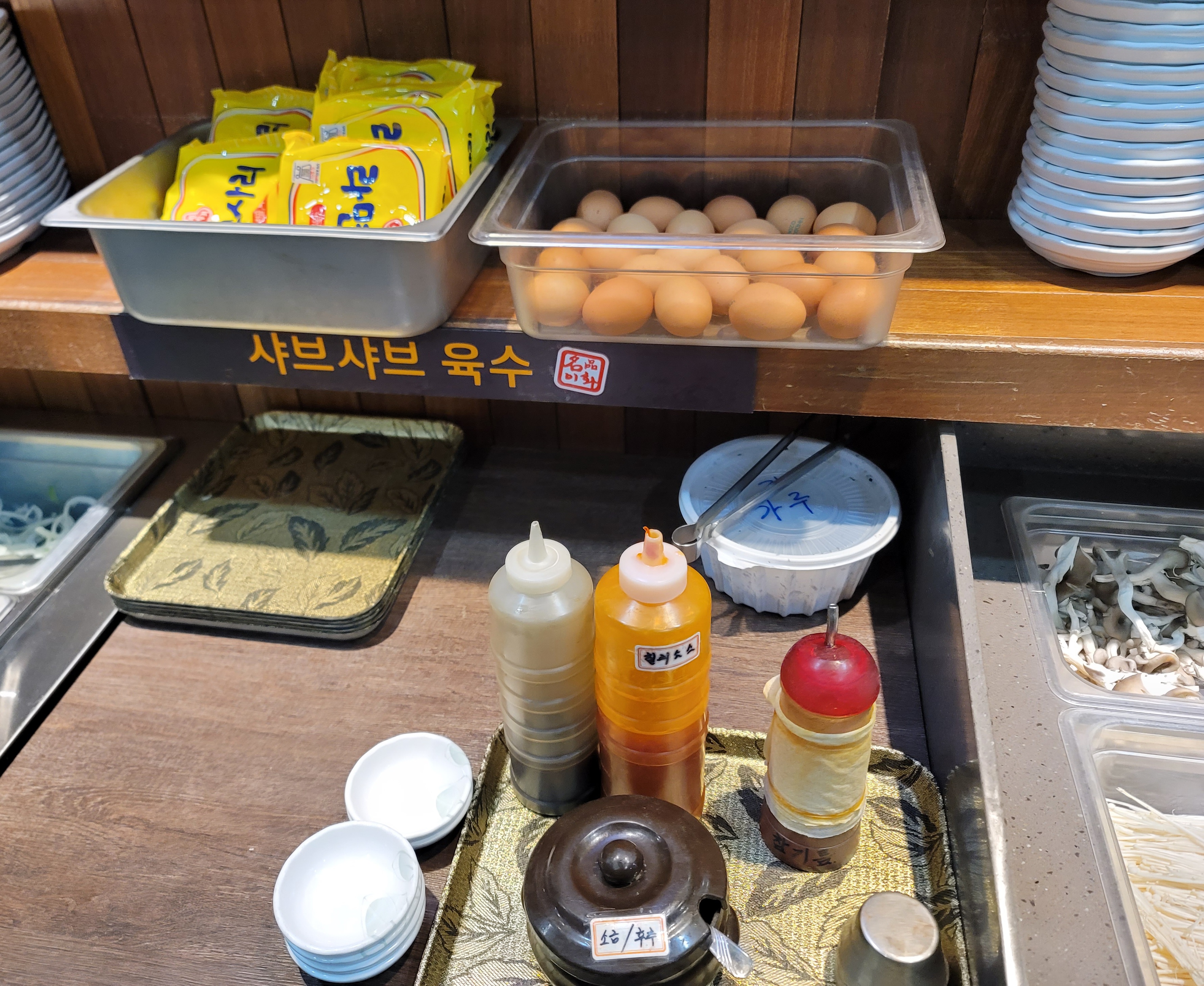 샤브샤브 공간에는 샤브샤브전문점 못지않게 소스와 육수, 볶음밥을 만들어먹을 수 있는 계란과 밥, 라면사리까지 준비되어 있습니다.