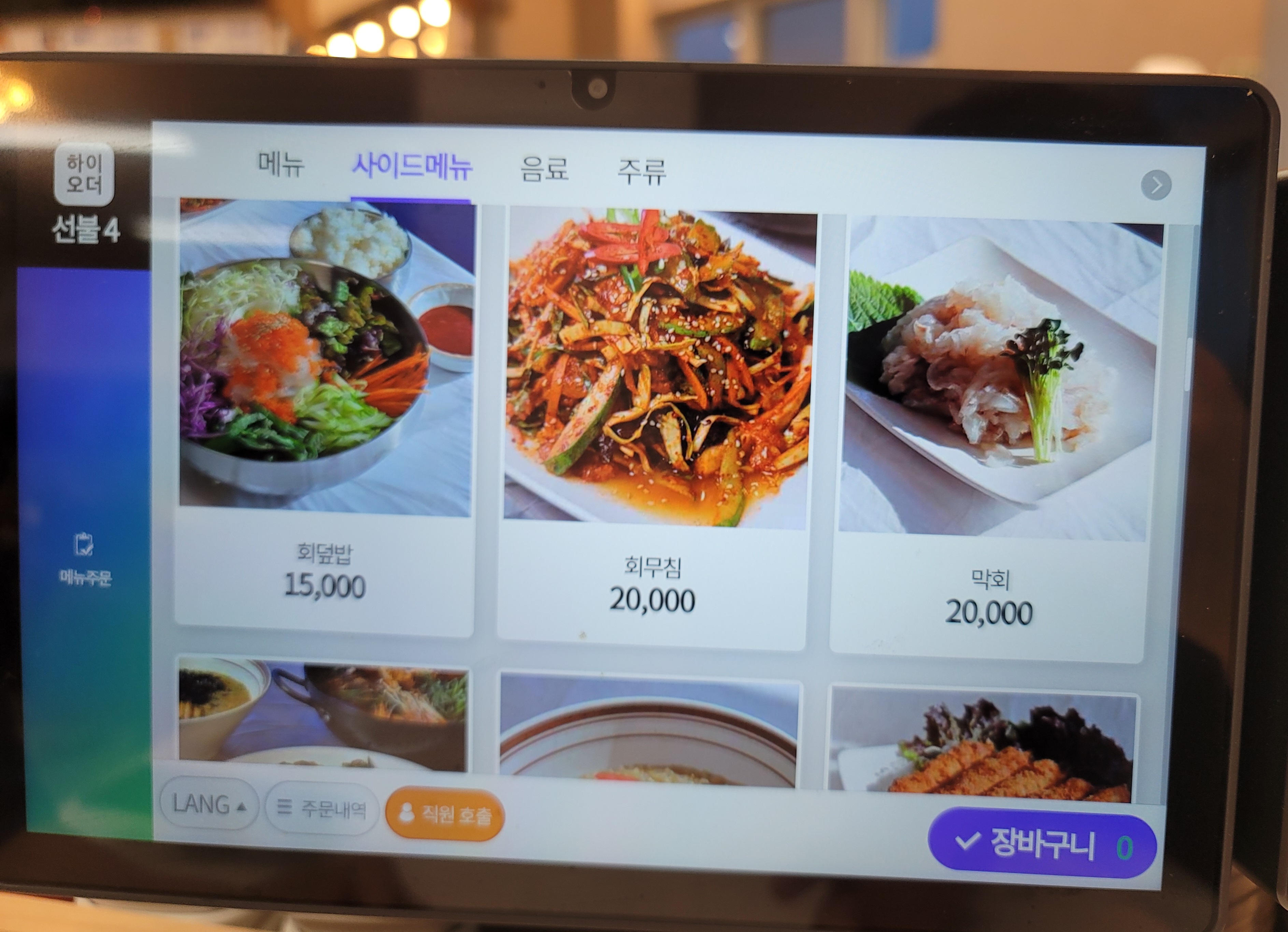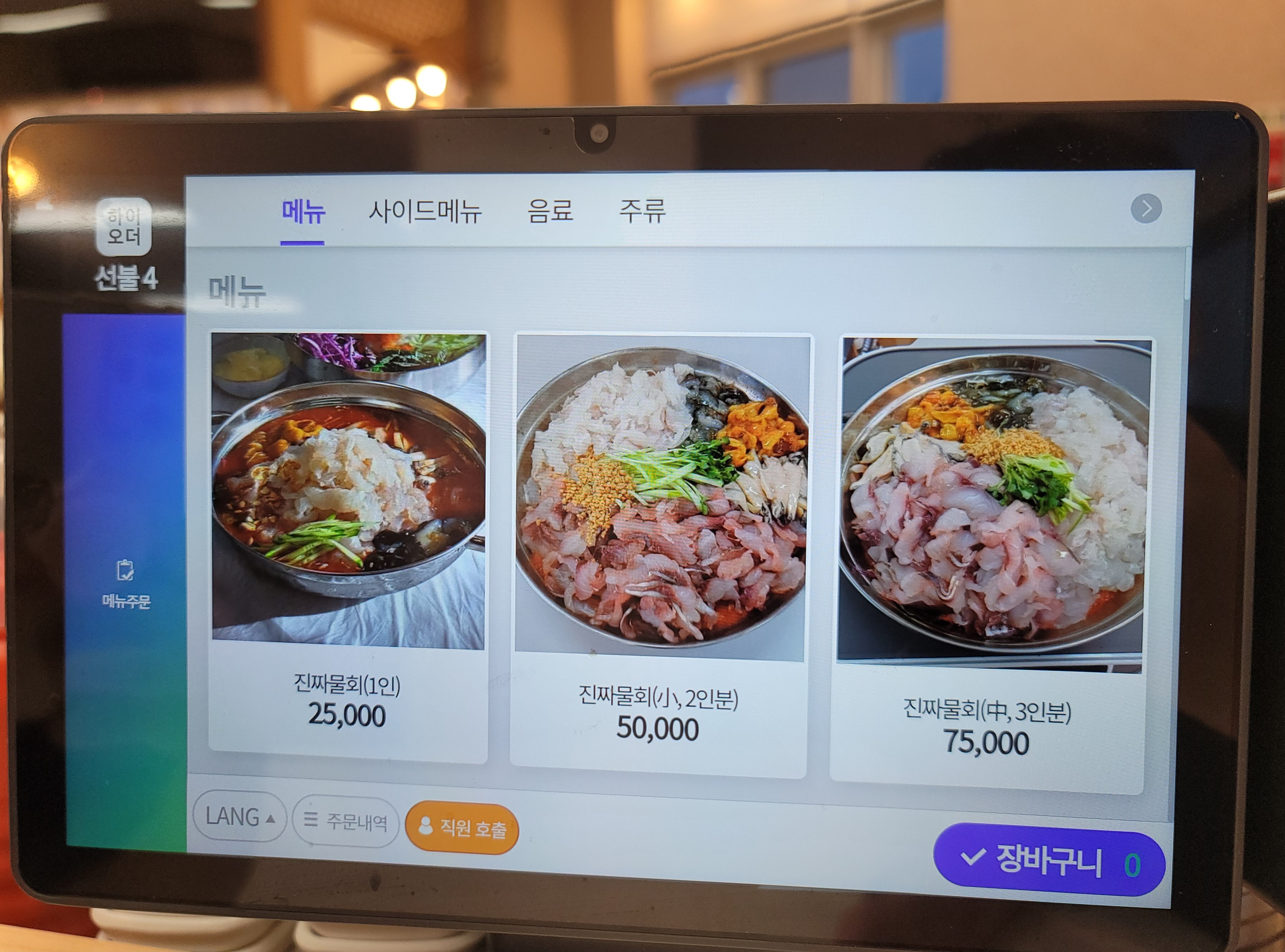 자리를 잡고 태블릿으로 메뉴를 찬찬히 살펴보고 일단 진짜물회소자를 주문하고 그렇게 맛이 좋다는 해물파전도 하나 주문했습니다.