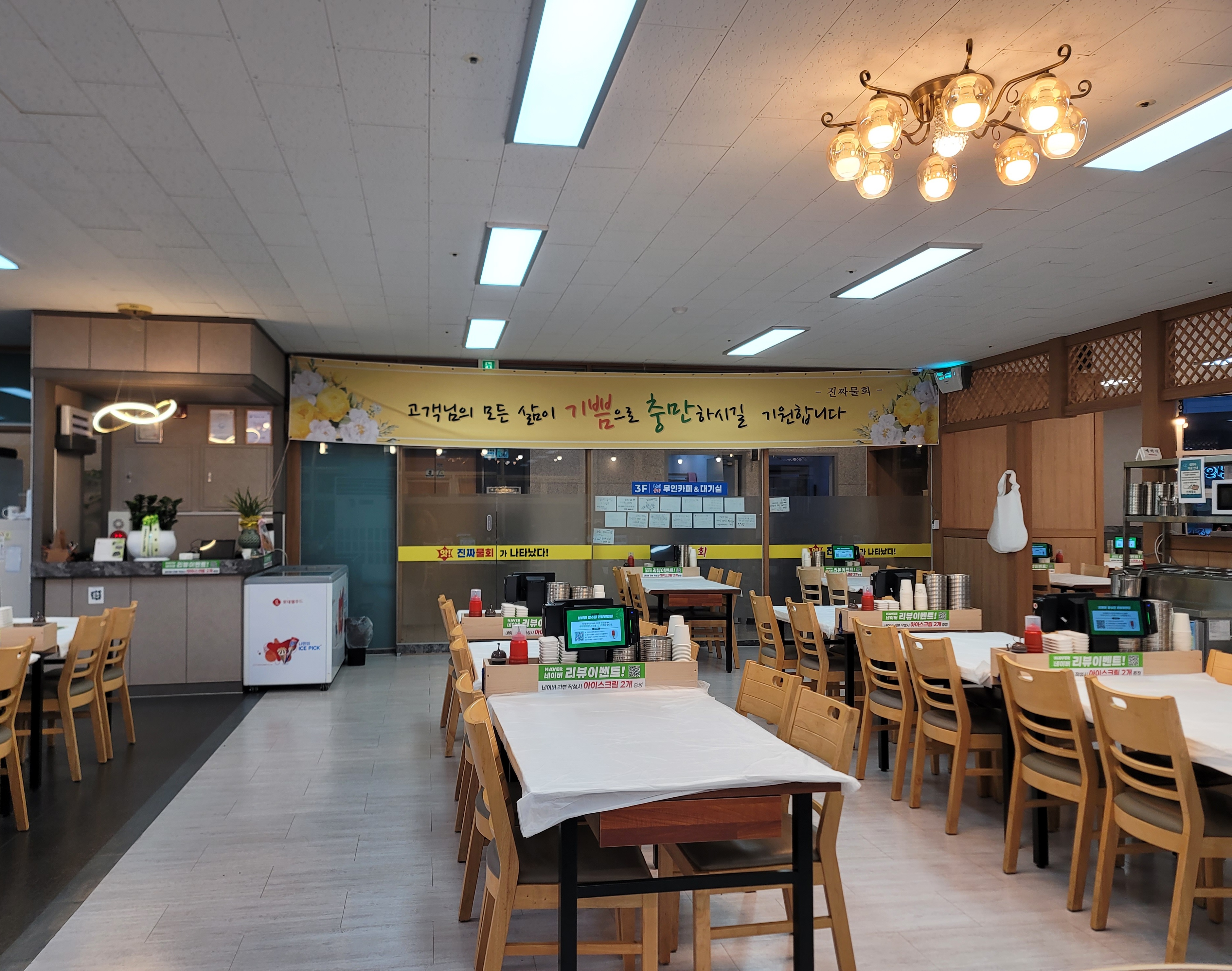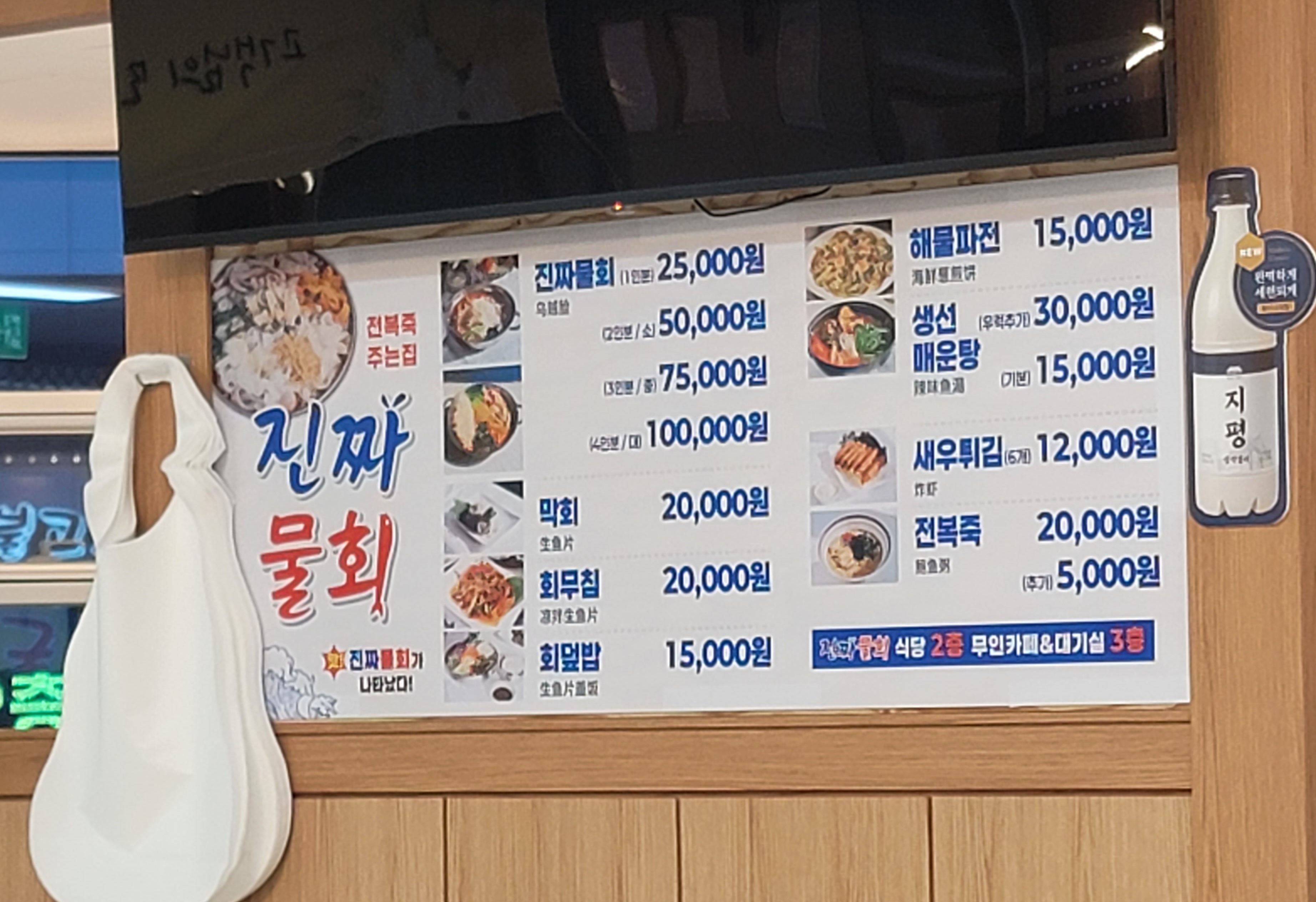 2층에 올라가면 진짜물회 식당이 엘리베이터를 내리자마자 보이고 꽤나 큰 면적을 갖고 있는 식당입니다.